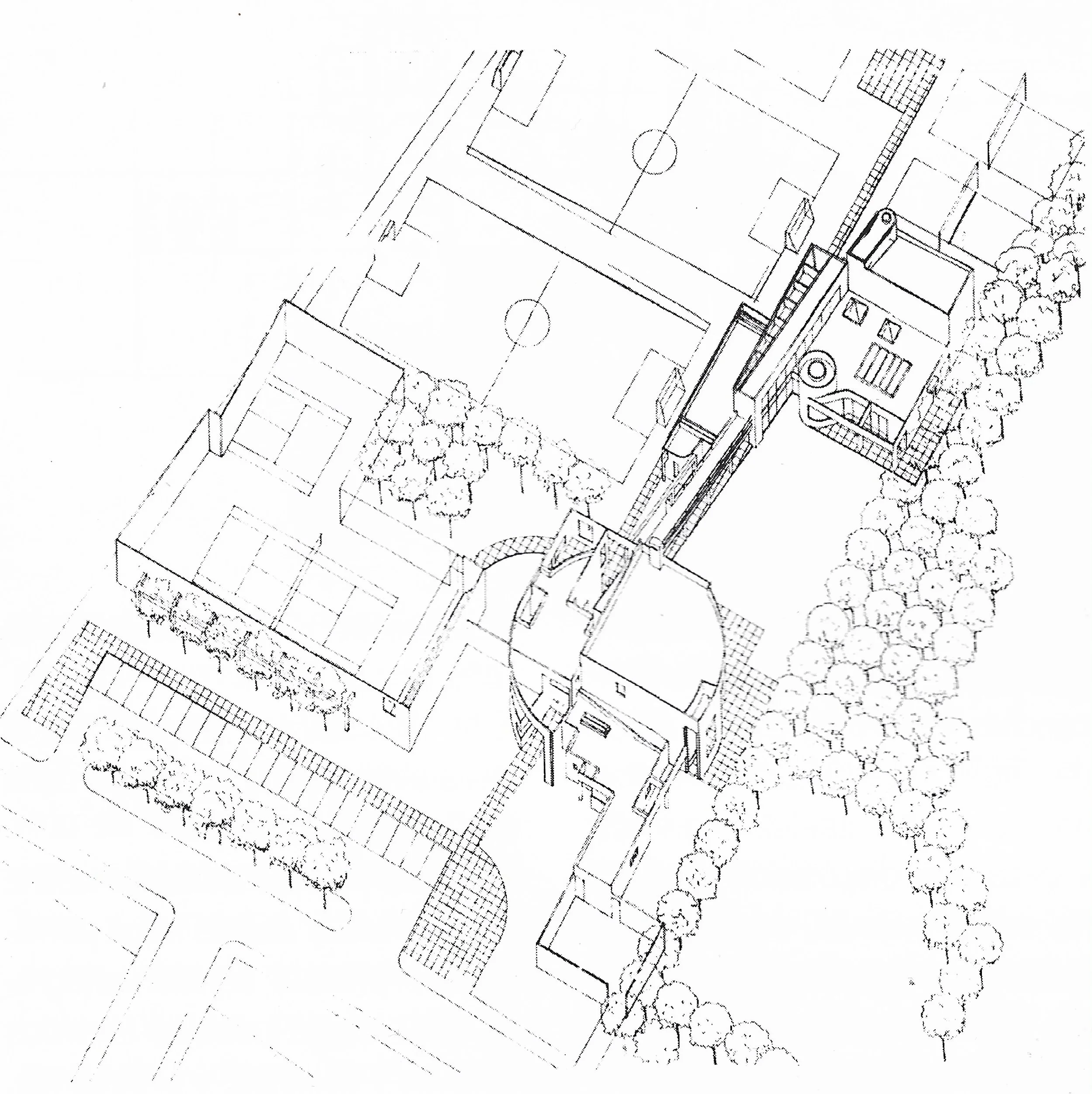 EL EDIFICIO SOCIAL SE ARMA EN BASE A UN CILINDRO Y EL SEGUNDO, EN BASE A UN CUBO, INTEGRADOS POR LA CIRCULACIÓN CENTRAL; LA CUAL REMATA COMO TELÓN DE FONDO, EL BOSQUE DE EUCALIPTOS QUE SE ENCUENTRA EN LA PARTE POSTERIOR DEL TERRENO. EL ESQUEMA ESTRUCTURAL OBEDECE A UNA MALLA DE 5m x 5m Y EL PROYECTO ESTA DISEÑADO EN MÓDULOS DE 50cm, TANTO EN PLANTA COMO EN ALZADOS. ESTA MALLA ESTRUCTURAL ESTA PENSADA PARA QUE LA LUZ QUE SE SALVE SEA LA MAS ECONÓMICA POSIBLE. LA CUBIERTA DE LA CIRCULACIÓN EXTERIOR SE APROVECHA PARA CREAR UNA TERRAZA-MIRADOR, DESDE LA CUAL SE PUEDE APRECIAR TODO EL PROYECTO. SE TRABAJA CON EXTERIORES Y ELEMENTOS ACCESORIOS BLANCOS, CON EL OBJETO DE LOGRAR UNA MONOCROMÍA QUE DESTAQUE LA NATURALEZA Y EL VERDOR PREDOMINANTES. LA CONSTRUCCIÓN ES EJECUTADA CON MATERIALES SENCILLOS Y, ESPECIALMENTE, AL SER UN EDIFICIO SEMIPÚBLICO, DE FÁCIL MANTENIMIENTO.
