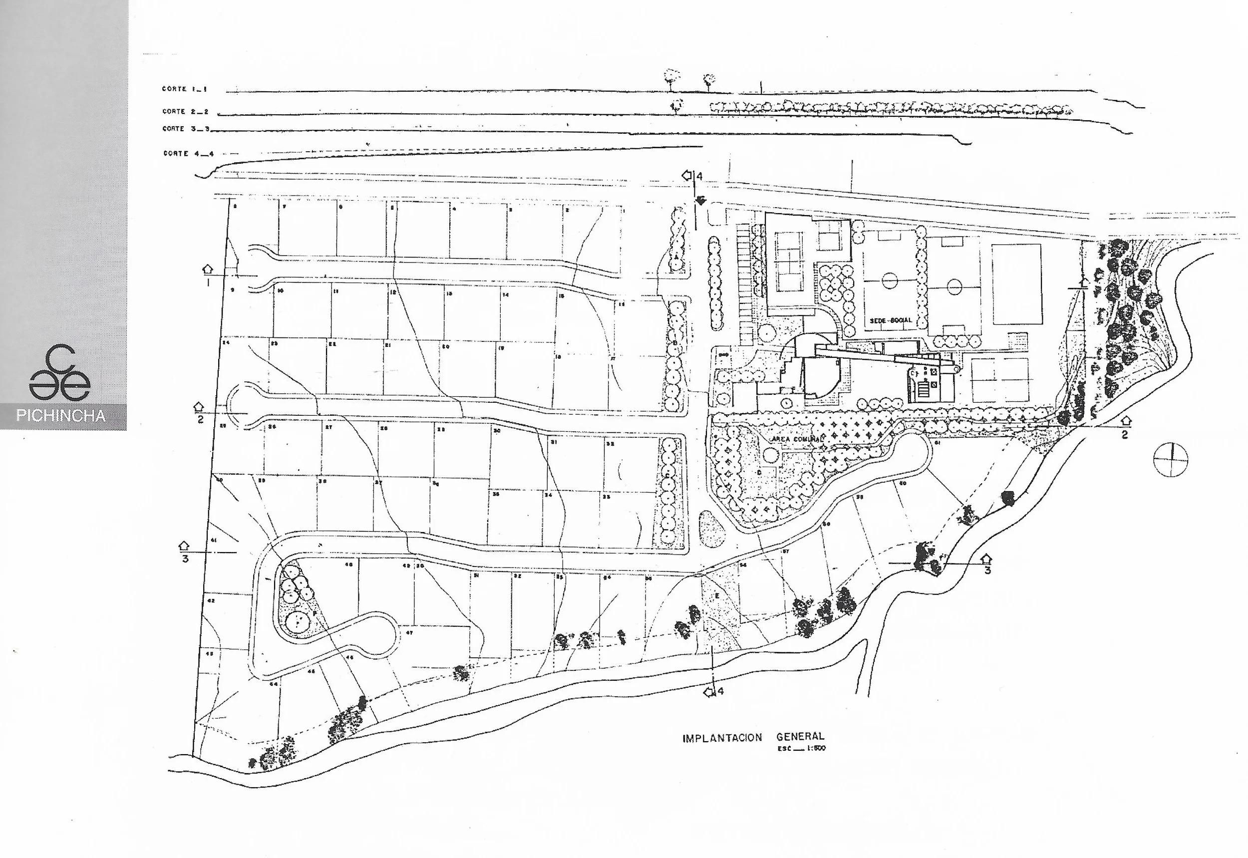 EL TERRENO PRESENTA TRES CONDICIONES BÁSICAS: A) LA DIVISIÓN DEL TERRENO EN DOS GRANDES LOTES, CUYA UBICACIÓN HA SIDO PREVIAMENTE ESTABLECIDA COMO PARTE DE LAS BASES. B) LA FRANJA DE PROTECCIÓN PARA LA LÍNEA DE ALTA TENSIÓN QUE CORTA EL TERRENO TRANSVERSALMENTE. C) LA QUEBRADA QUE LIMITA EL TERRENO AL SUR Y LA PARTICULAR VEGETACIÓN QUE CARACTERIZA TODA ESTA FRANJA. LO EXPUESTO DETERMINA QUE LA ÚNICA ENTRADA AL CONJUNTO SE HAGA APROVECHANDO LA ZONA DE RETIRO PROVOCADA POR LA LÍNEA DE ALTA TENSIÓN.
